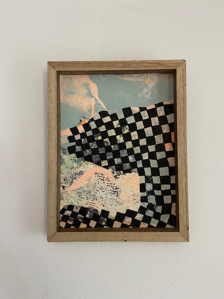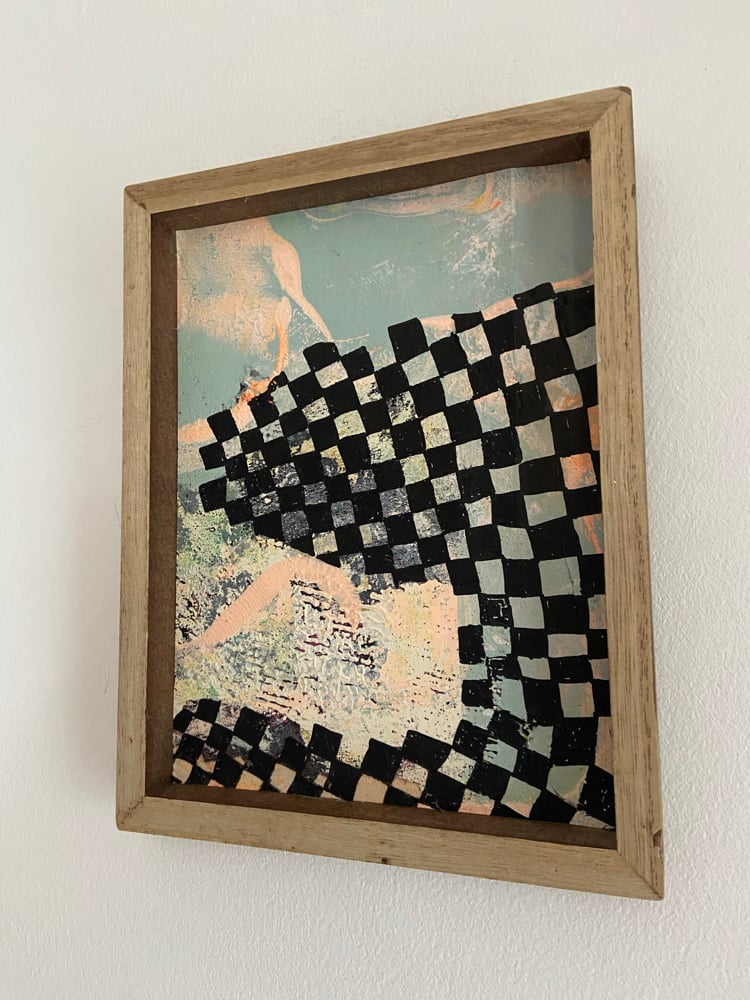 One of an ongoing ‘All Boxed In’ series. ‘No waste art’ using up printed and painted packaging fragments - repurposing frames and permanently embedding the printed pieces inside the aperture. No glass included so you can see and touch the surface texture.