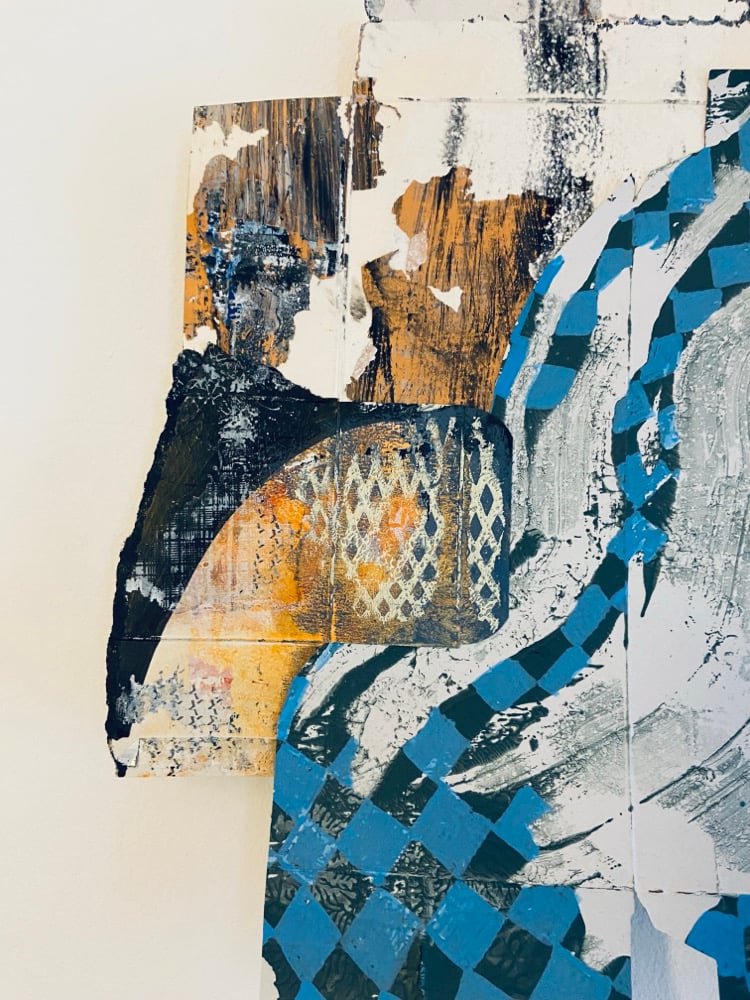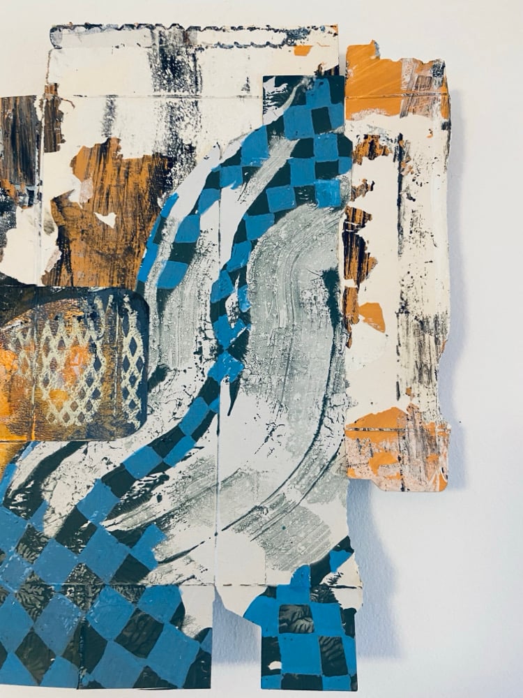 I’m inspired by the urban environment I see everyday and the traces left by human activity. I reuse packaging materials to print and paint onto before cutting or ripping them and constructing abstract compositions.